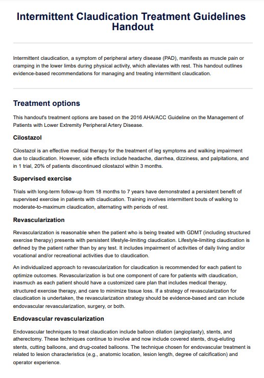 Discover comprehensive Intermittent Claudication Treatment Guidelines Handout. Manage symptoms, improve blood flow, and reduce cardiovascular risks effectively.