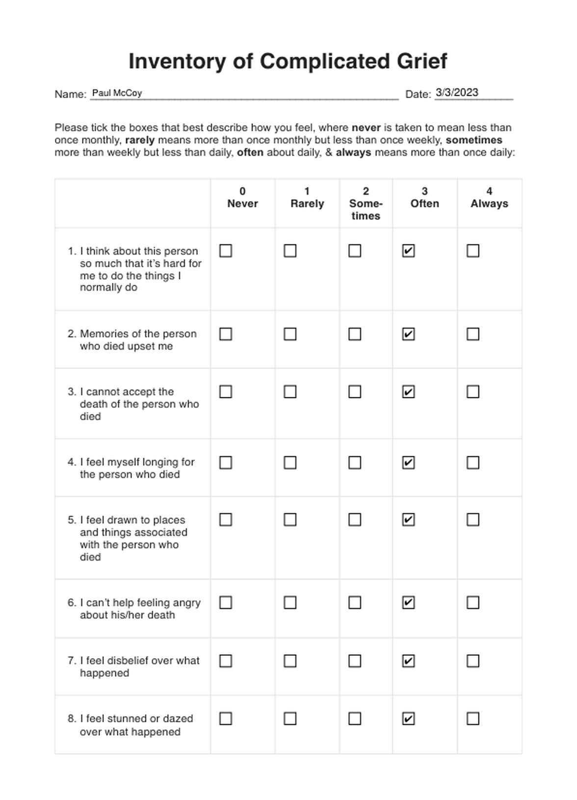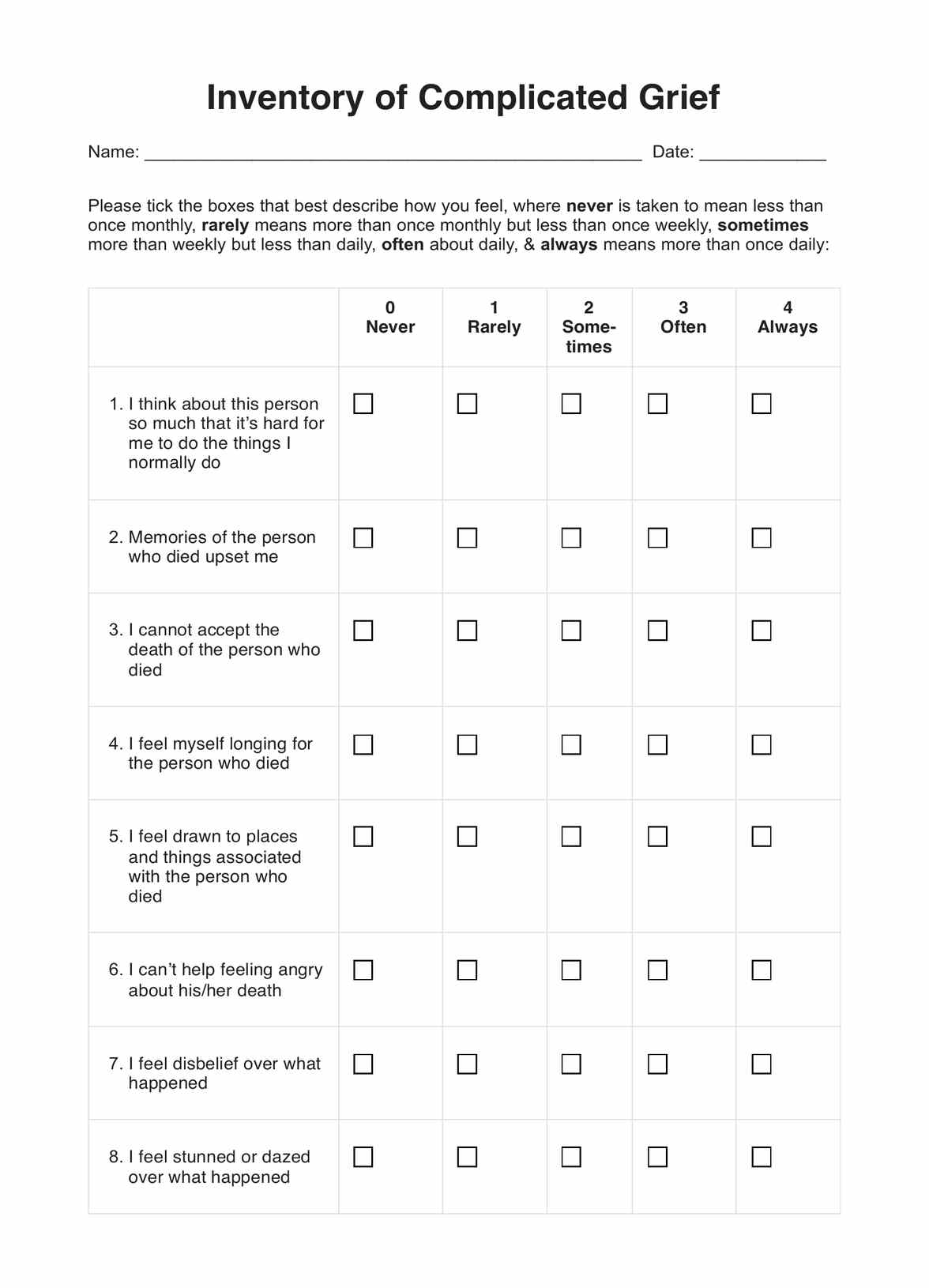 Download a free Inventory of Complicated Grief PDF template and example. Learn more about this scale for measuring complicated grief.