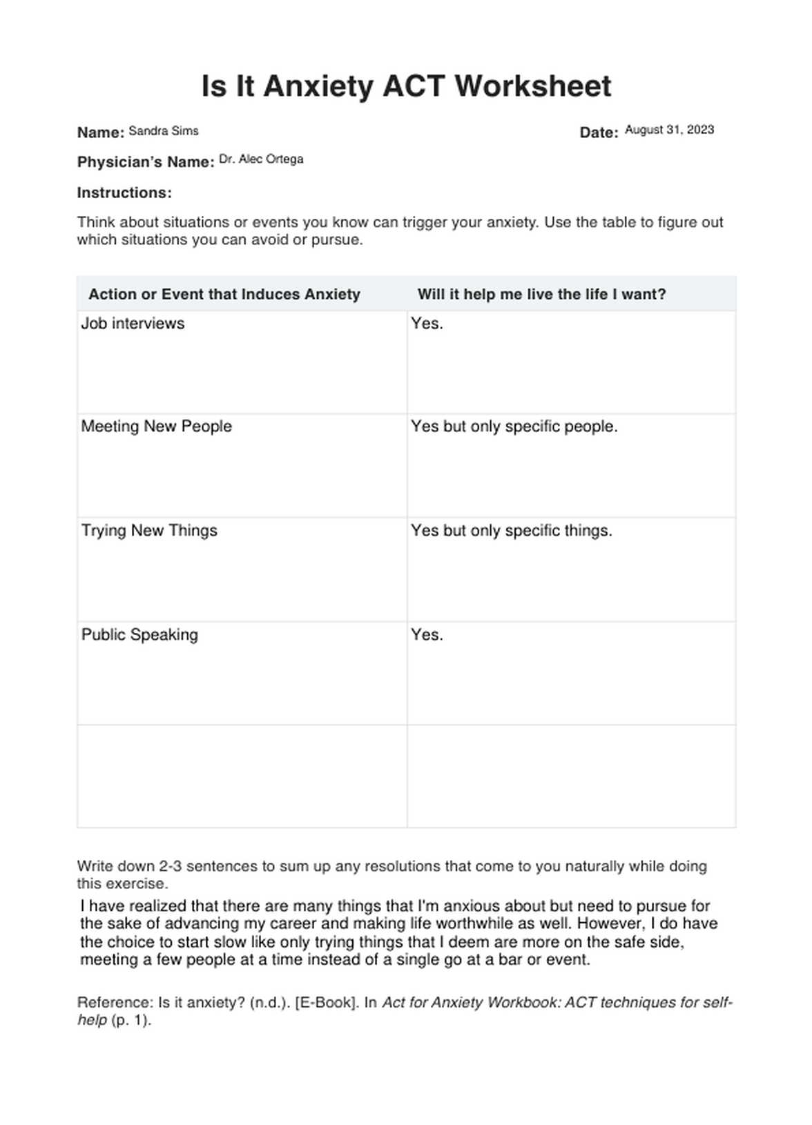 Practitioners qualified to conduct ACT sessions can use the Is It Anxiety ACT Worksheet. On the other hand, clients with any type of anxiety disorder or who often feel anxious can also use this worksheet.