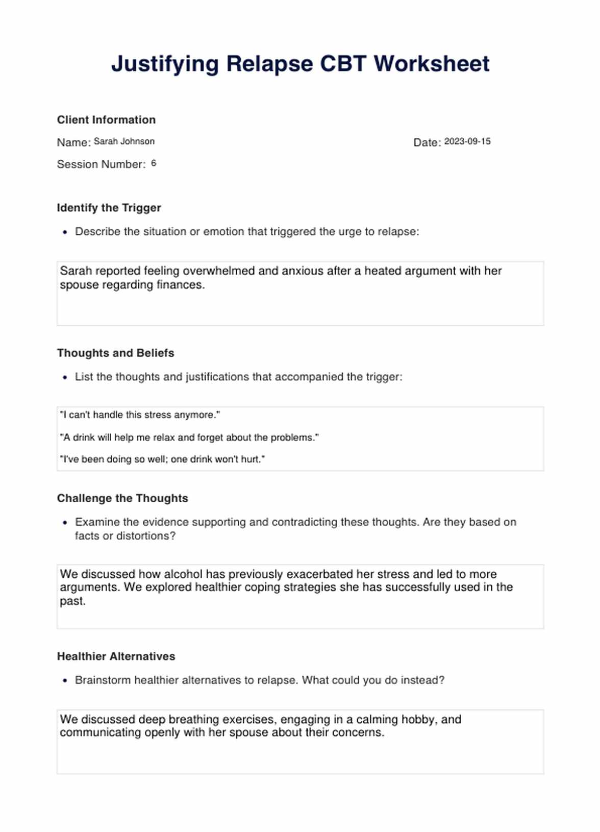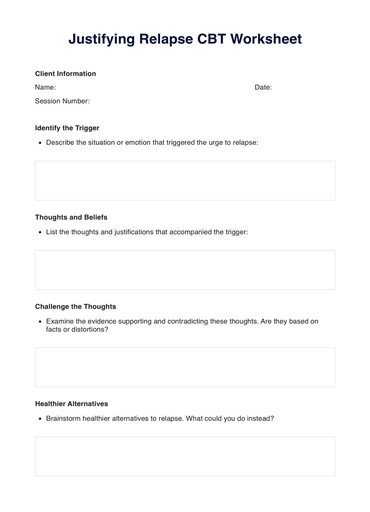 Prevent relapse with our Justifying Relapse CBT Worksheet. Identify triggers, challenge thought patterns, and build resilience. Start your journey to sobriety today.