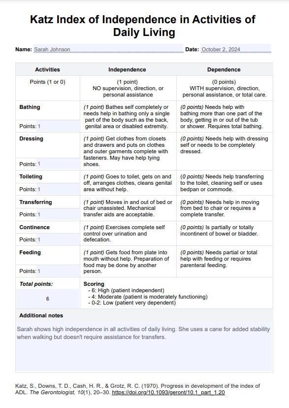 The Katz Index is interpreted based on the total score. A score of 0 indicates total dependence in ADLs, while a score of 6 indicates complete independence. Scores in between indicate varying degrees of either dependence or independence.
