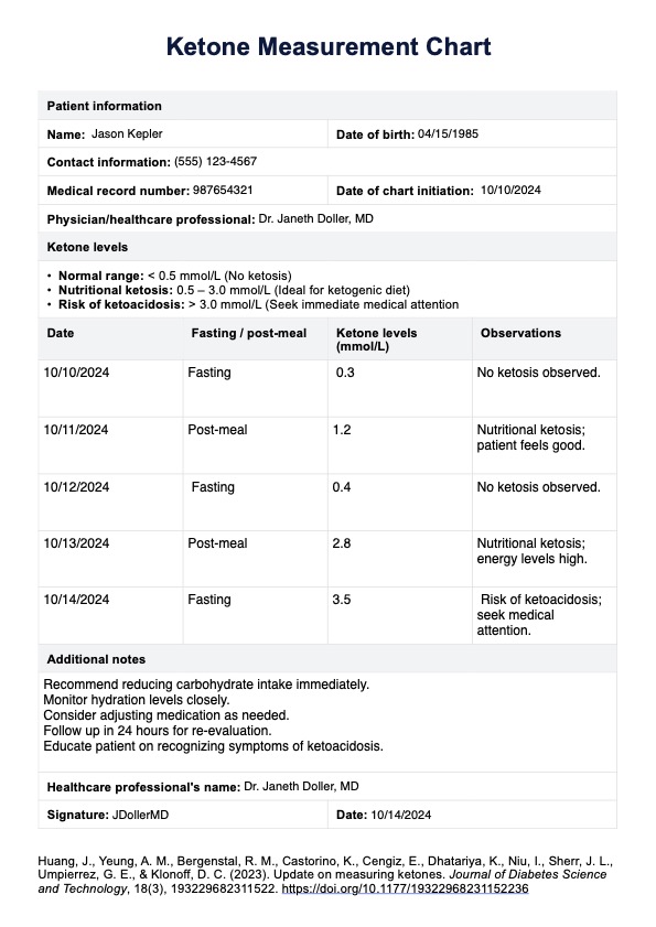 The Ketone Measurement Chart Template is designed to help healthcare professionals and patients track and monitor ketone levels effectively. This tool provides a systematic way to record ketones levels for ketosis, aiding in the assessment of metabolic states, particularly for those following a keto diet or experiencing conditions like diabetic ketoacidosis (DKA).