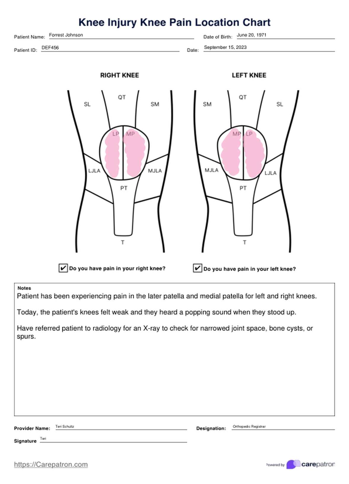 You can use the knee injury knee pain location charts during a physical examination or to track the progress of the patient on a treatment plan.