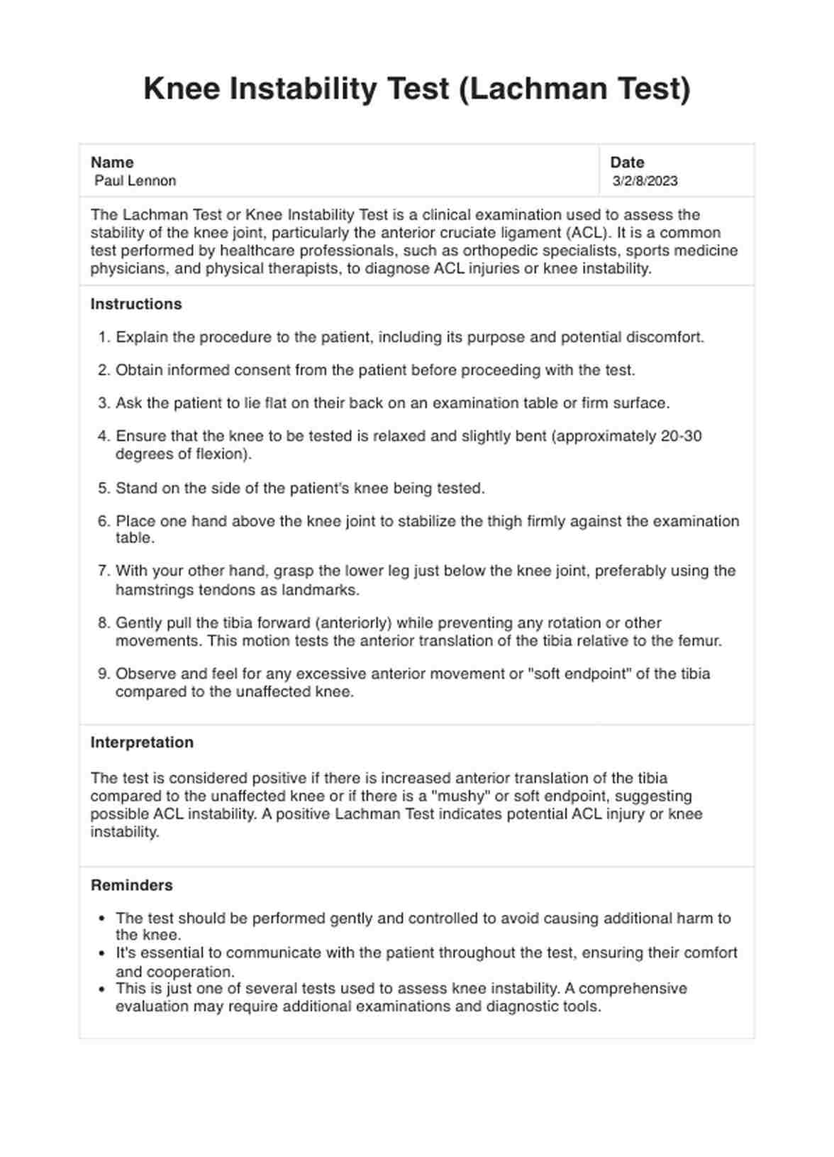 Knee Instability Test Template