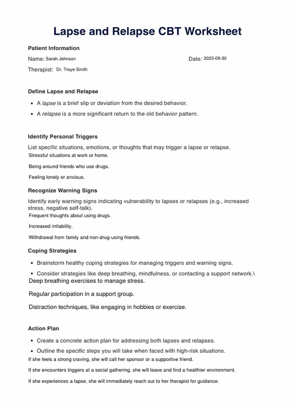 Prevent setbacks with the Lapse and Relapse CBT Worksheet. Identify triggers, warning signs, and coping strategies in your behavior change journey.
