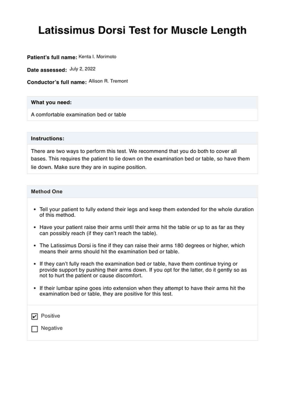 Yes. This test requires you to check for any movement in the lumbar spine or arms while conducting it. If the lumbar spine extends while conducting the first method, they are positive. If their arms rise up when you push their legs into a posterior tilt, then they are positive.