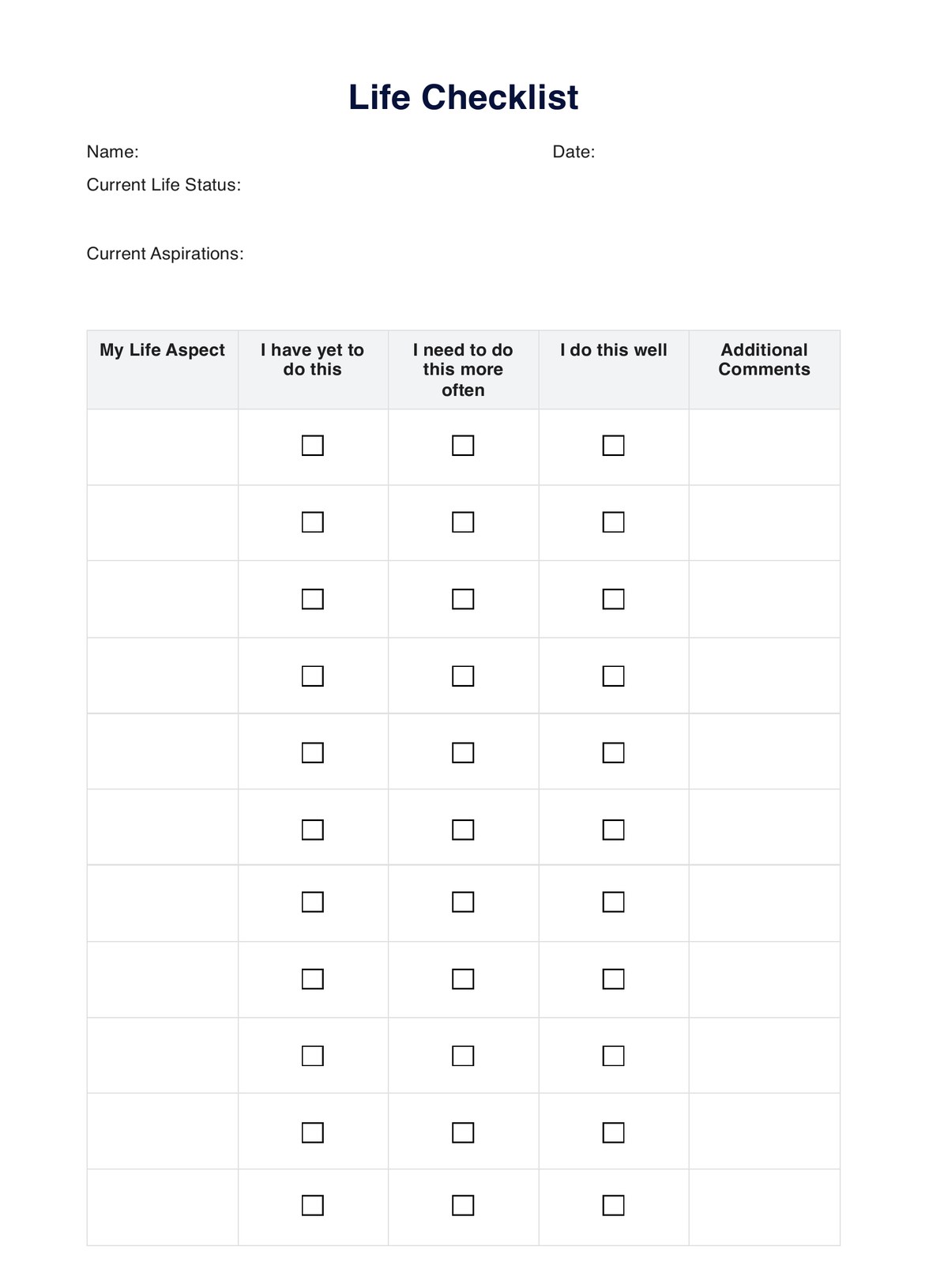 This resource can be easily created using our Life Checklist Template! The template provides an organized structure, allowing you to simply focus on planning your approach.