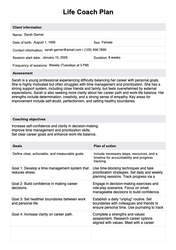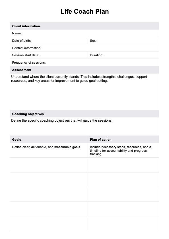 Plan your coaching sessions with our free Life Coach Plan template. Set goals, track progress, and empower your clients.