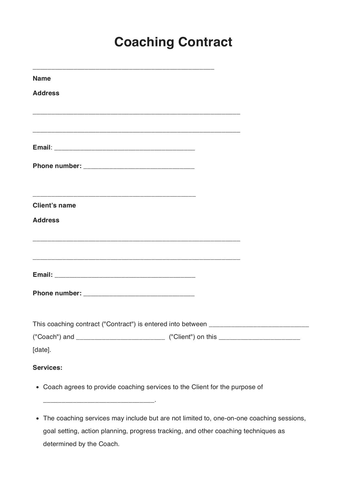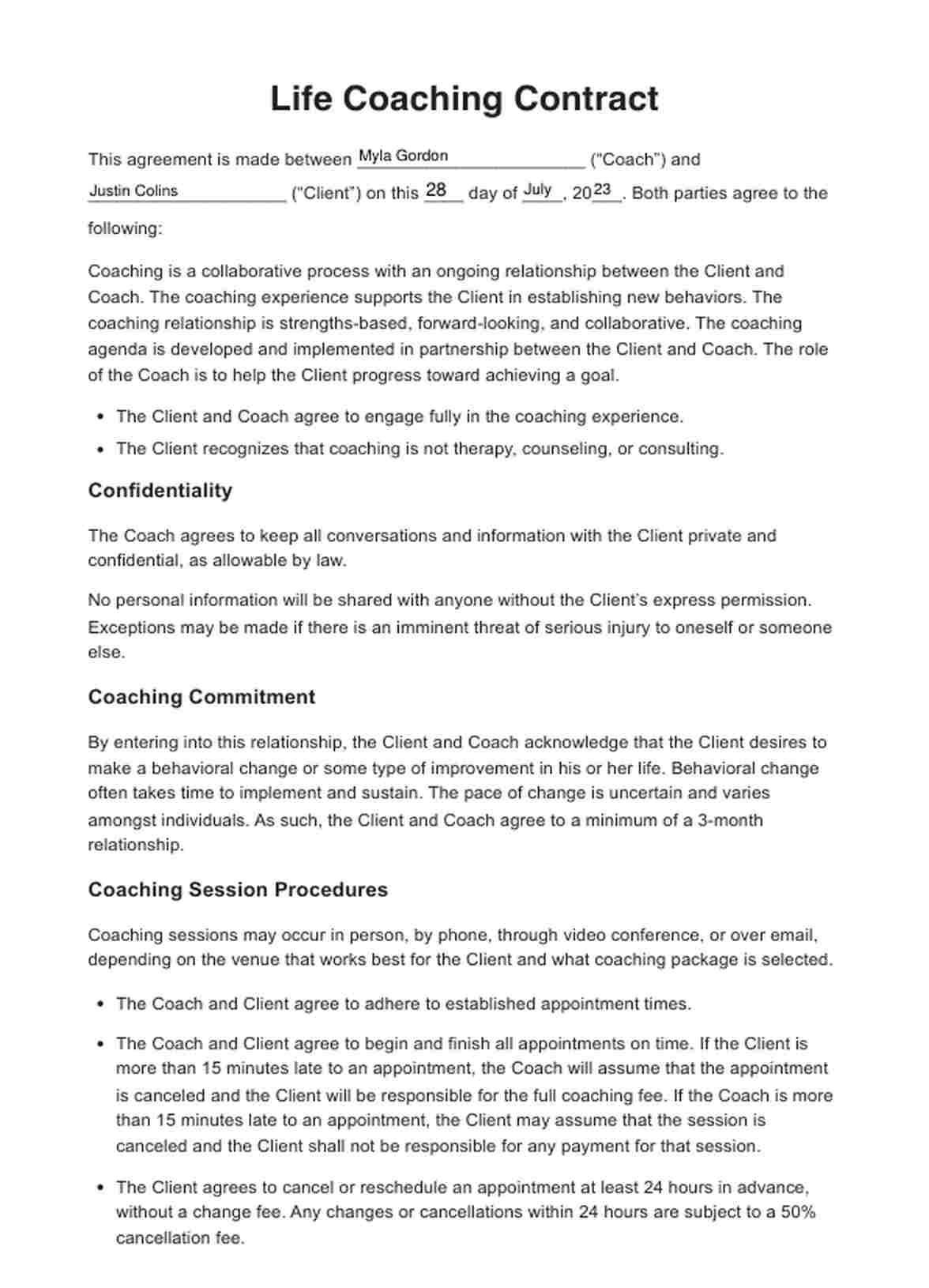 Life coaching contracts outline the services offered, the responsibilities of both coach and client, scheduling, payment terms, confidentiality policies, and any other agreements pertinent to the coaching relationship. They are signed by both parties to indicate mutual agreement and understanding.