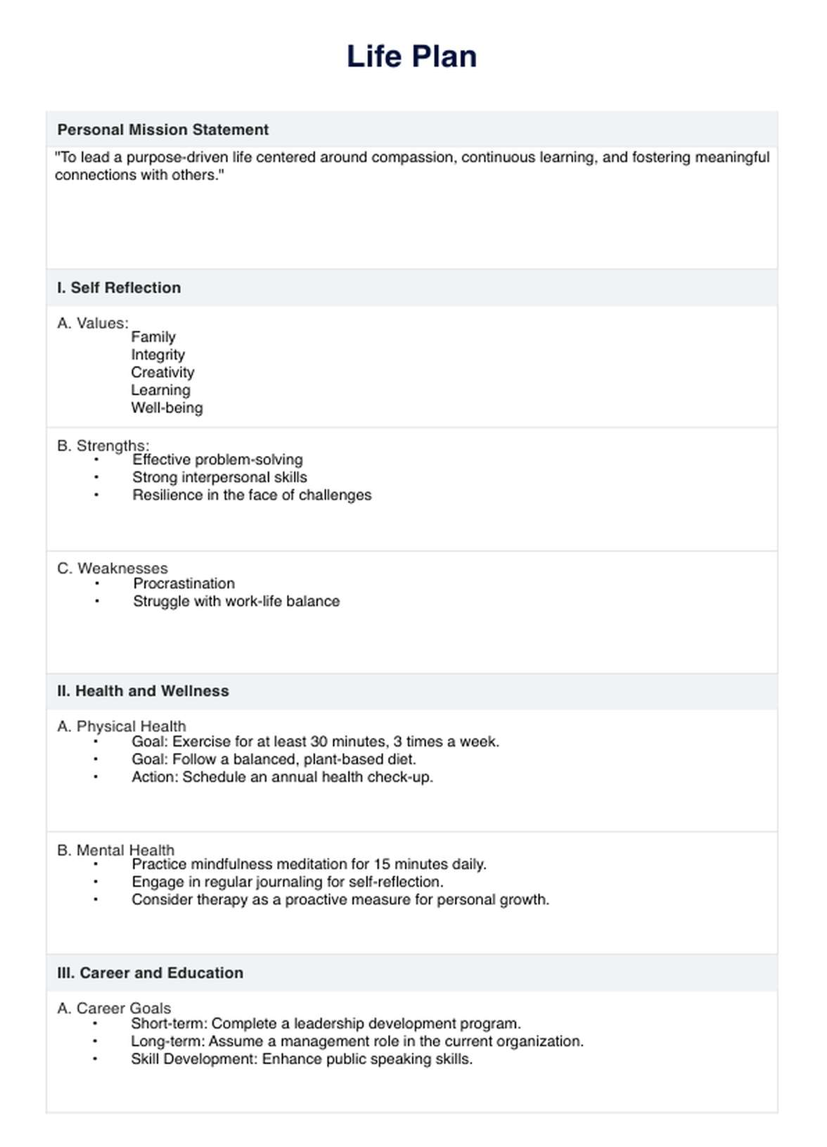 They are used to fill in specific sections for career, relationships, health, and personal development. Leverage Carepatron's life plan app to access dynamic adaptability, integrated health coaching, and professional guidance for a holistic approach to intentional living.