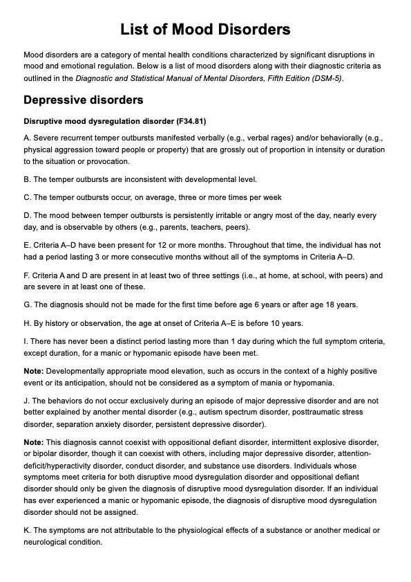 List of Mood Disorders Template