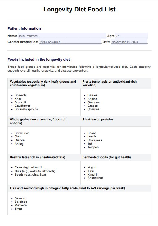 Help clients explore foods that promote healthy aging with our Longevity Diet Food List Template.