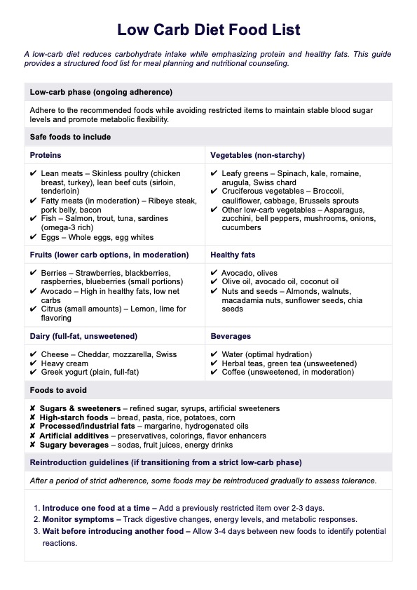 Use Carepatron's free Low-Carb Diet Food List PDF as a valuable resource in supporting patient nutrition management.