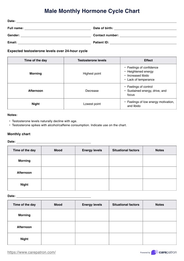 Use this male monthly hormone cycle chart to help your male patients track their 24-hour hormone cycle, long-term for their overall well-being.