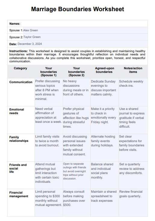 The Marriage Boundaries Worksheet is designed to help couples establish healthy boundaries within their relationship. It promotes effective communication and respect for personal space. This worksheet lets partners identify their emotional needs and set clear expectations.