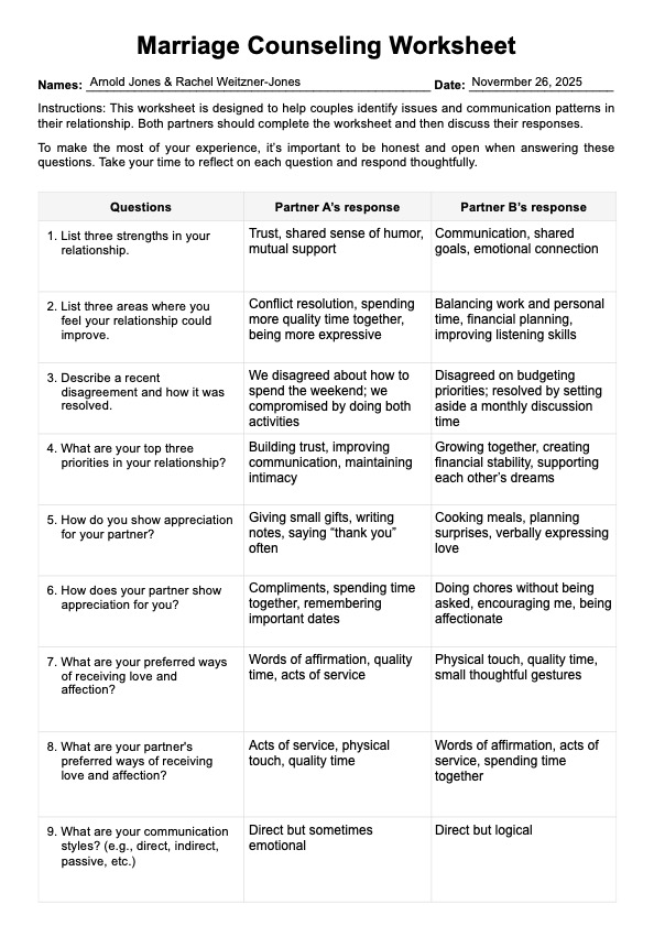 Improve your clients' relationship with our Marriage Counseling Worksheet to identify issues and enhance communication. Download a free PDF today!