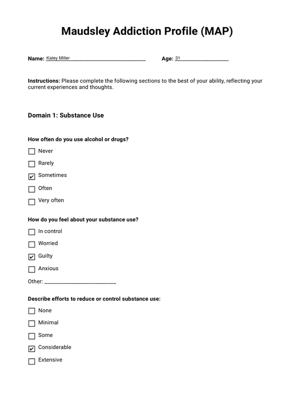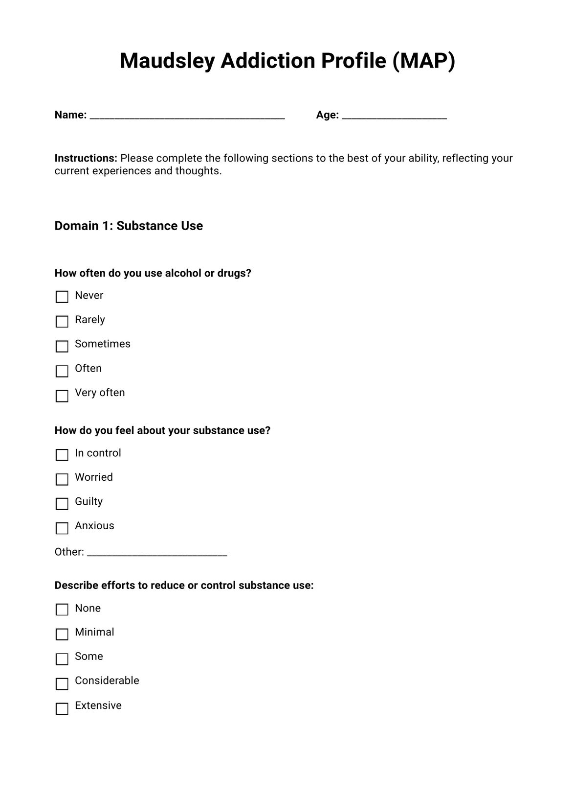 Completing the Maudsley Addiction Profile (MAP) typically takes around 15 minutes. This concise yet comprehensive assessment efficiently evaluates various dimensions of substance use and its impact on an individual's life.