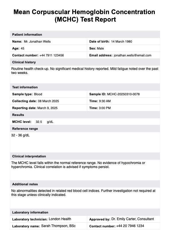 Get access to a free MCHC Blood Test Report template. Create reports for MCHC blood testing and monitor hemoglobin concentration and related conditions.