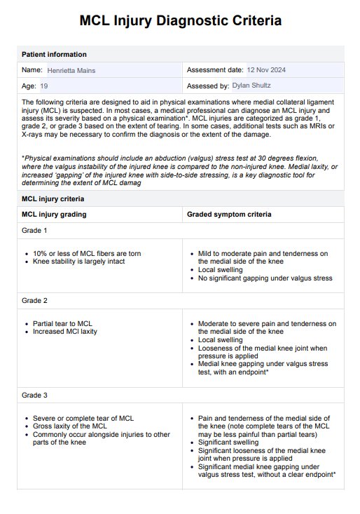 Access a helpful MCL Injury Diagnostic Criteria template for evaluating MCL injuries.