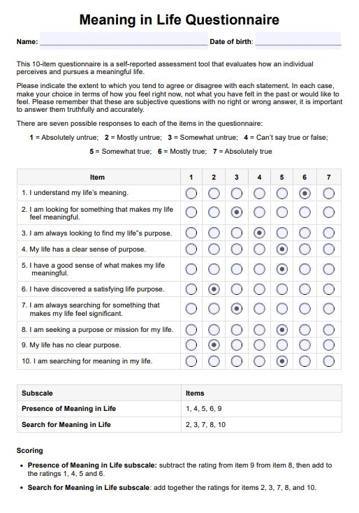 The Meaning in Life Questionnaire (MLQ) contains 10 items, with 5 items each assessing the Presence of Meaning and Search for Meaning subscales.
