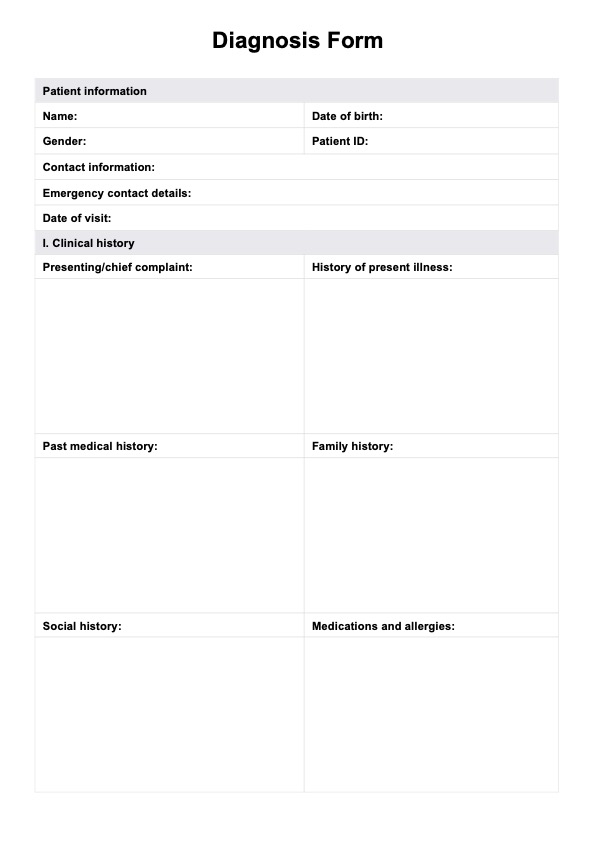 Access a Medical Diagnosis Form template for healthcare professionals and comprehensively gather patient information for accurate diagnosis documentation.