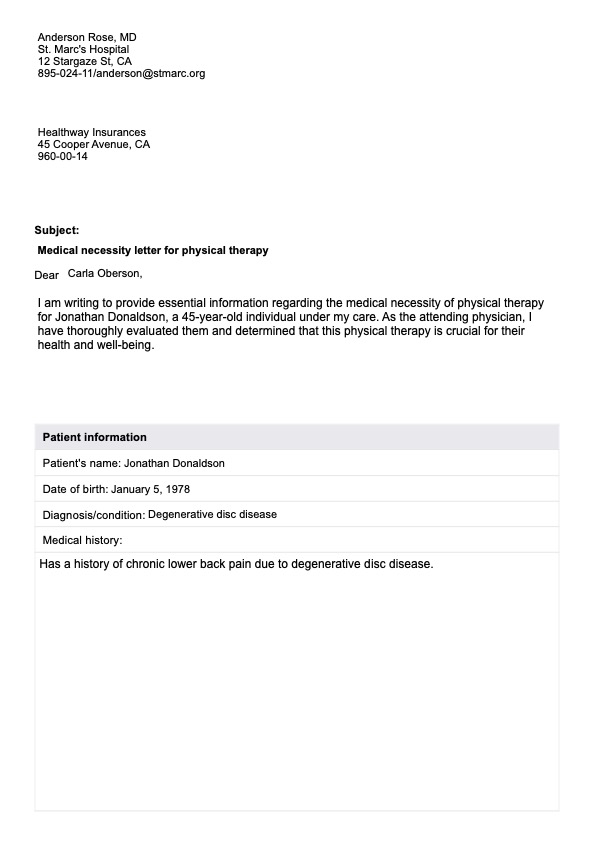 Yes, our template is fully customizable to fit your needs and the individual patient's case. When a patient drops by to consult you, gather all the necessary information to build your Medical Necessity Letter