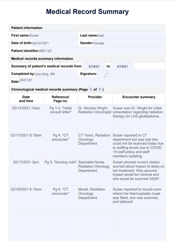 Summarize the key points from your patient’s medical record in a concise, chronological, and easy-to-follow format using our handy Medical Record Summary Template.