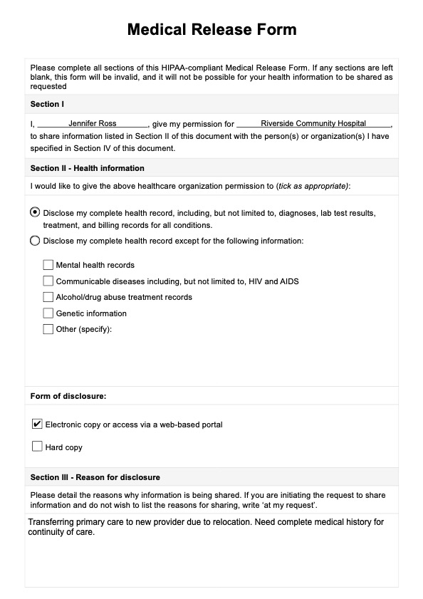 Provide patients with a helpful Medical Release Form template to facilitate sharing their medical information for different purposes.