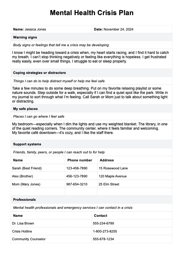Anyone with mental health conditions, such as anxiety disorder, depression, or a history of substance abuse, can benefit from a crisis plan. It’s particularly useful for those at risk of sudden behavioral changes or escalating symptoms. The plan can also support family members, therapists, and trusted persons in providing care during emergencies.