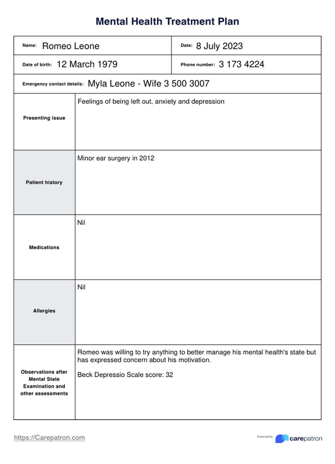 A mental health treatment plan is typically used for patients with existing or potential mental health issues. You can use it to assess changes in symptoms or conditions and refer them for additional mental health services.