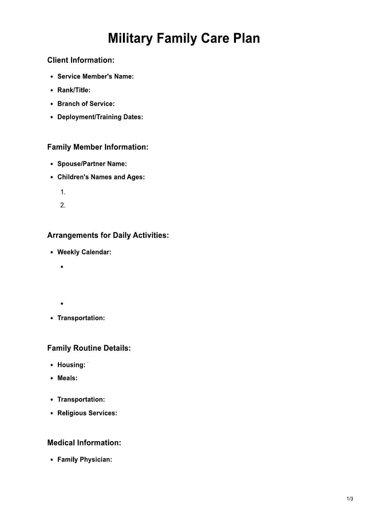 A Military Family Care Plan is a comprehensive document that outlines arrangements for caring for family members when a service member is deployed or otherwise unavailable due to military duties.