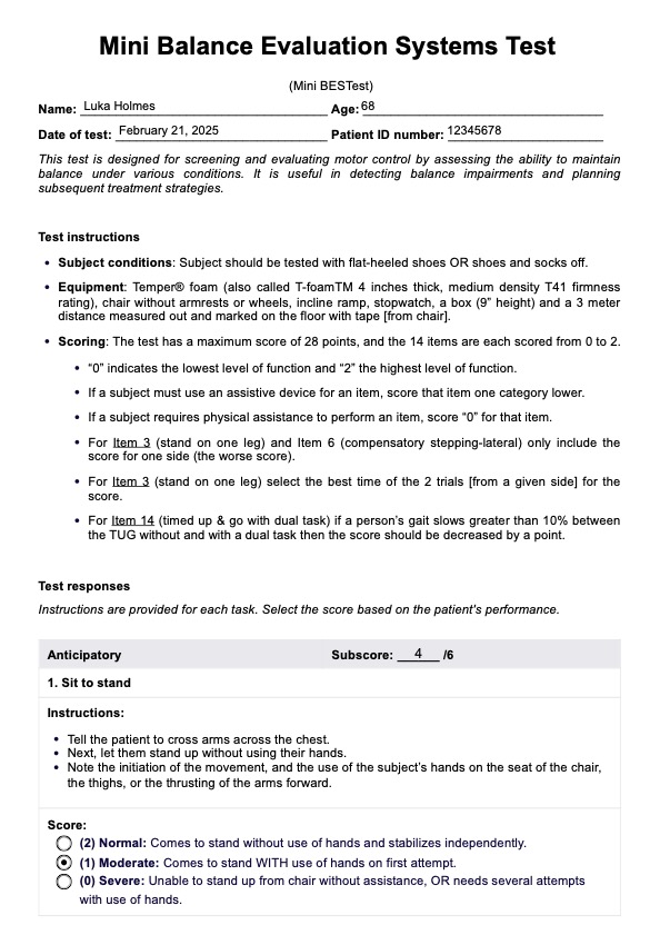 It should take between 15 to 30 minutes to fully accomplish the Mini BESTest. This will depend on how capable your patient is.
