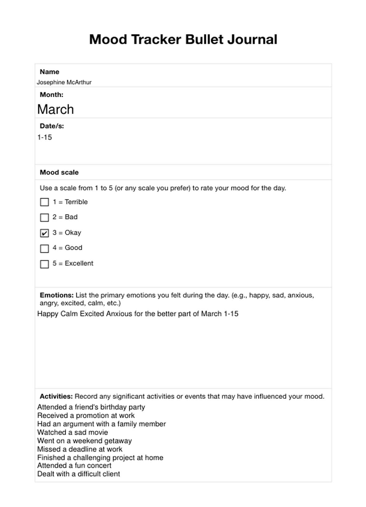 When using a Mood Tracker Bullet Journal, clients can write down their feelings or rate them (e.g., on a scale from 1-10) and journal how they feel. This practice allows them to understand better their mental processes, triggers, and responses to different events or situations.