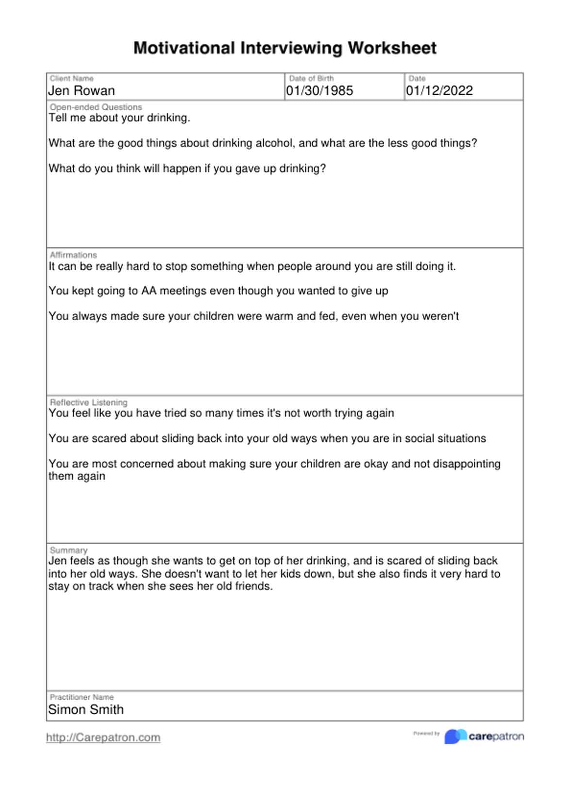 Motivational interviewing worksheets can be a useful tool for taking notes during or shortly after a client’s session with you. This is to ensure you recall the motivational interview techniques you used with your client, and don’t forget any details.