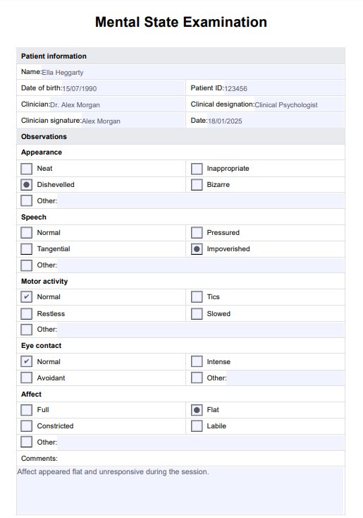 A mental status examination (MSE) is typically performed during an initial psychiatric assessment, follow-up appointments, or when changes in a patient’s mental status are observed. It is also useful for tracking treatment progress.