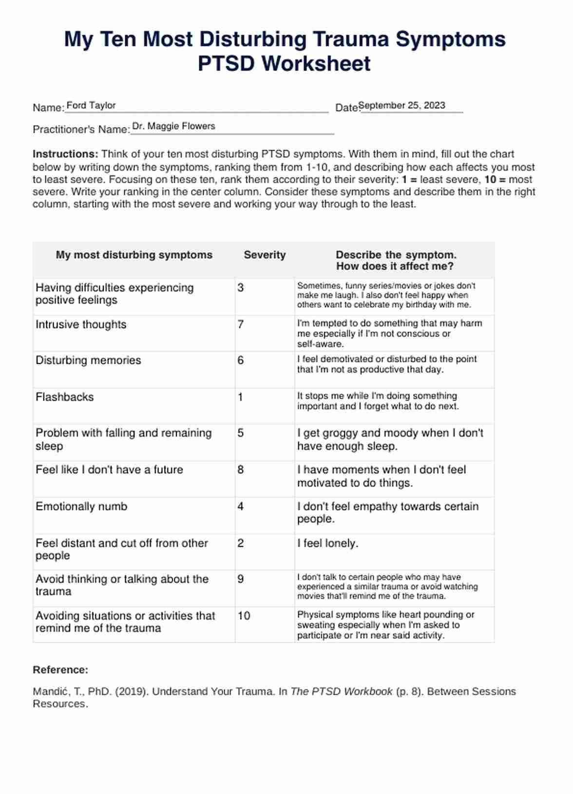 The “My Ten Most Disturbing Trauma Symptoms PTSD Worksheet” is best used after the client has listed down all of their PTSD symptom or before a treatment plan has been formulated.