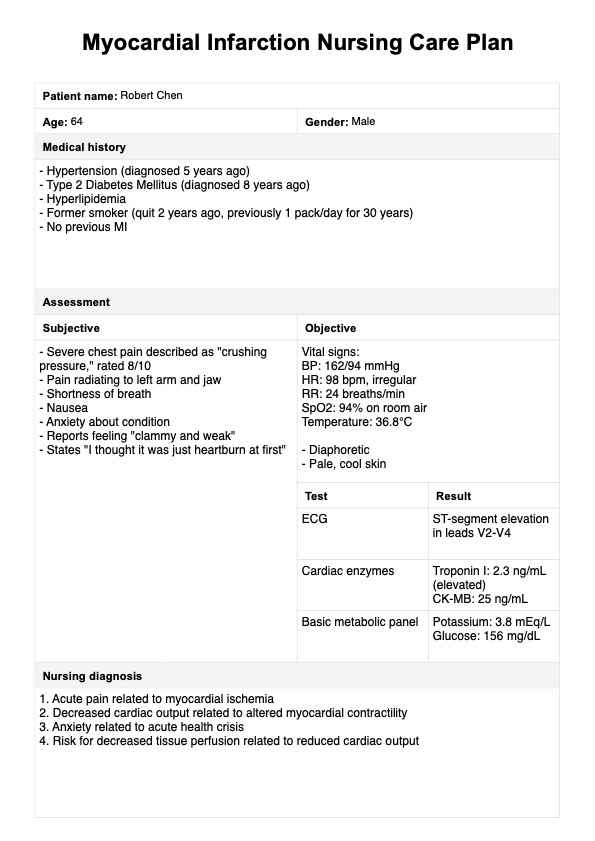 Use our Myocardial Infarction Nursing Care Plan Template to assess and create interventions for patients who experienced a myocardial infarction.