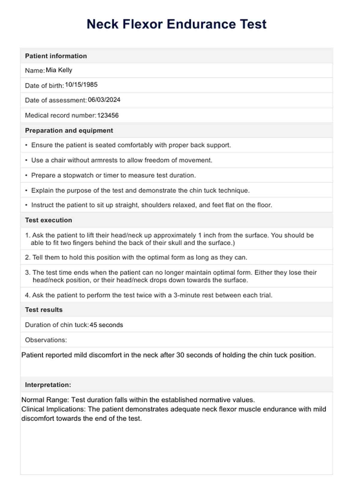 Learn about the Neck Flexor Endurance Test, including how it is conducted and what it measures. Download Carepatron's free PDF example to see how this test is performed.