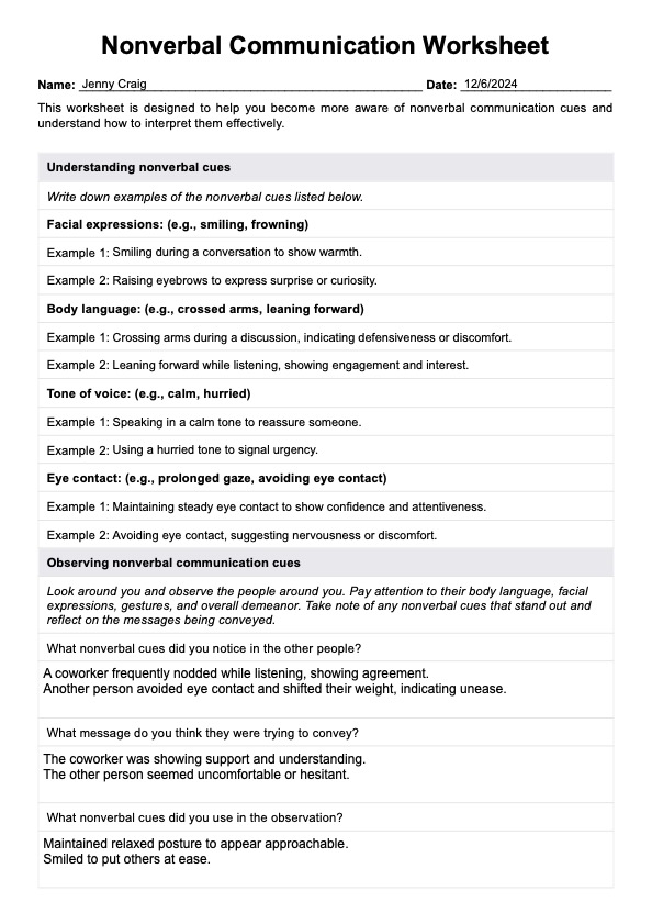 Enhance client interactions with our Nonverbal Communication Worksheet for practitioners. Master body language, tone, and expressions for effective communication.