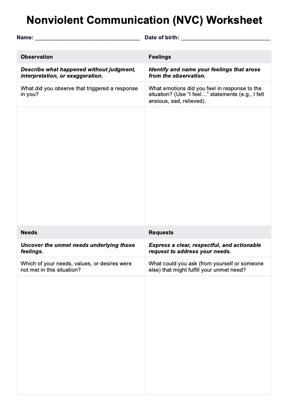 Download Carepatron's free Nonviolent Communication Worksheet to help patients practice NVC principles and improve their interpersonal communication skills.