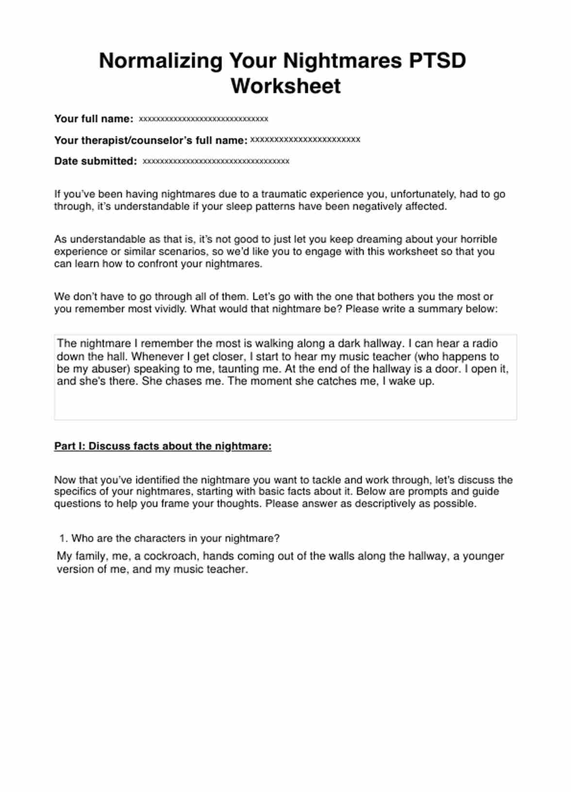 It depends on the person. Based on the instructions, the worksheet shouldn’t be challenging to accomplish. What might cause difficulty is thinking about the nightmares. These cause PTSD patients distress, and thinking about their nightmares might make them uneasy since they will likely remind them of their traumatic experiences.