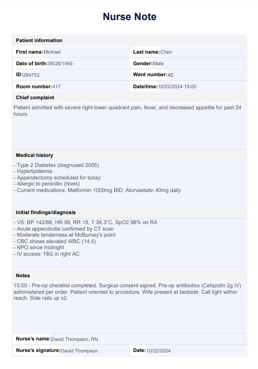 An example of a bad nursing note would be one that is vague, incomplete or lacks clarity. For instance, a note stating "Patient seems okay" without specific observations or data fails to provide useful information for other healthcare providers. Notes that contain spelling errors or excessive jargon or are written long after the event can lead to misunderstandings and compromise patient care.