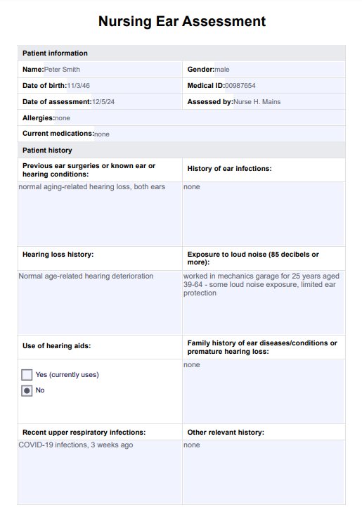 A Nursing Ear Assessment is a thorough evaluation of the external ear canal, middle ear, and inner ear to identify any abnormalities or signs of ear disorders. It typically entails a physical inspection, otoscopy (to look at the ear canal and tympanic membrane), hearing tests (to detect hearing impairment), and patient interviews (to understand symptoms like ear pain or discharge). Nurses also assess the need for interventions such as ear drops or hearing aids based on the patient's status.