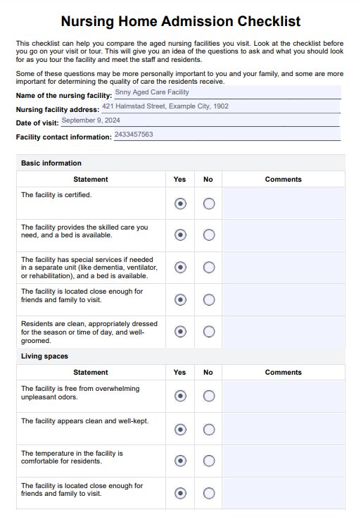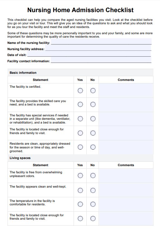 To create a comprehensive Nursing Home Admission Checklist, utilize the checklist provided by Carepatron and identify priorities for you and your loved ones from the list that resonate with the kind of care you are seeking.