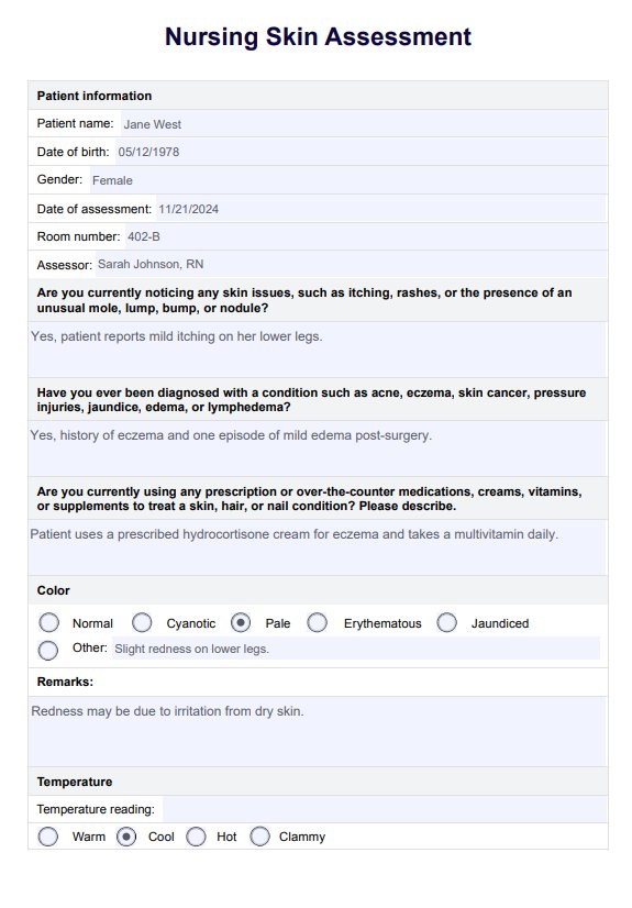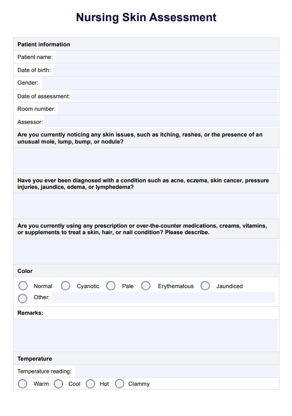 Learn the importance of nursing skin assessment, how to conduct it thoroughly, and document your findings with Carepatron's free PDF download.