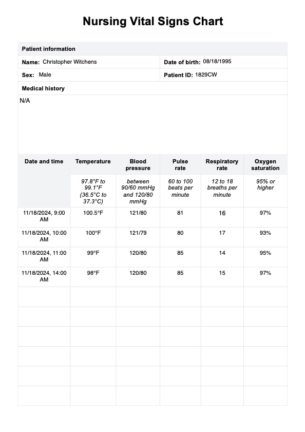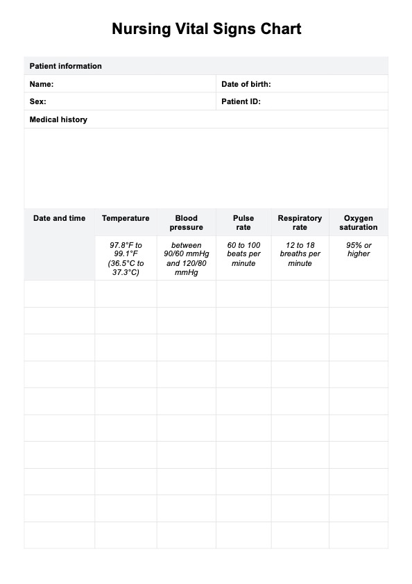 Optimize patient care with our Nursing Vital Signs Chart. Track and analyze crucial health indicators for informed healthcare decisions.