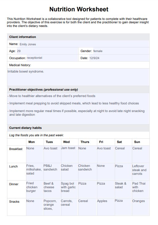 A Nutrition Worksheet is a tool for tracking and analyzing a client's food intake and habits for better client management. It helps practitioners transition clients from receiving supported nutrition advice to being able to maintain healthy eating independently.