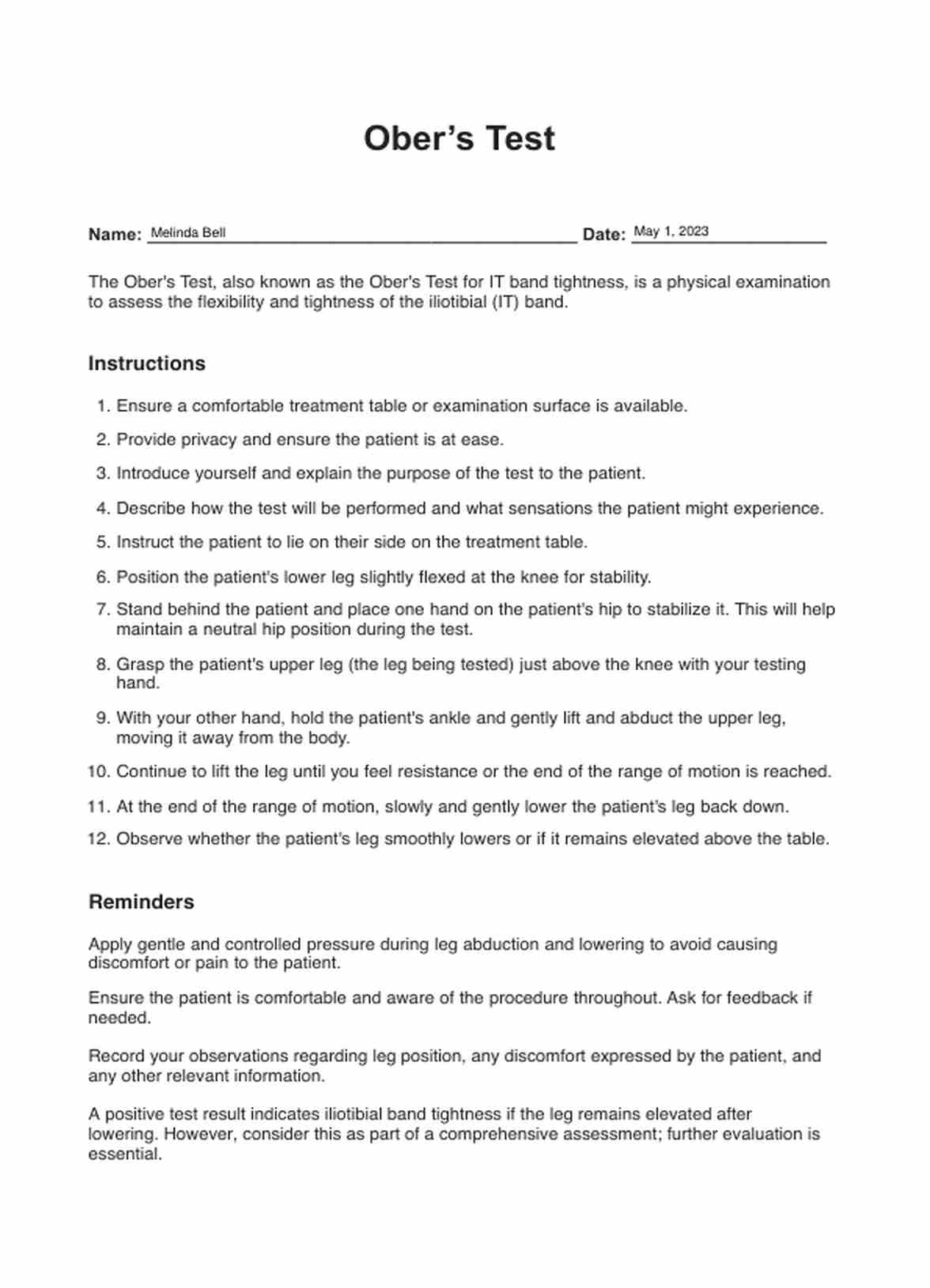 Learn about the Ober’s Test, a diagnostic procedure for assessing tightness in the IT band. Download a free PDF guide and example for your practice now.
