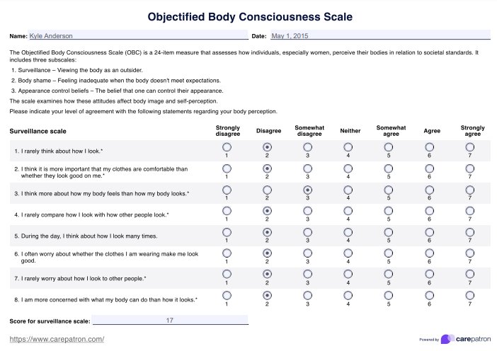 The Objectified Body Consciousness Scale is a 24-item assessment tool that measures how individuals perceive their bodies in relation to societal standards, with a focus on body surveillance, body shame, and appearance control beliefs.