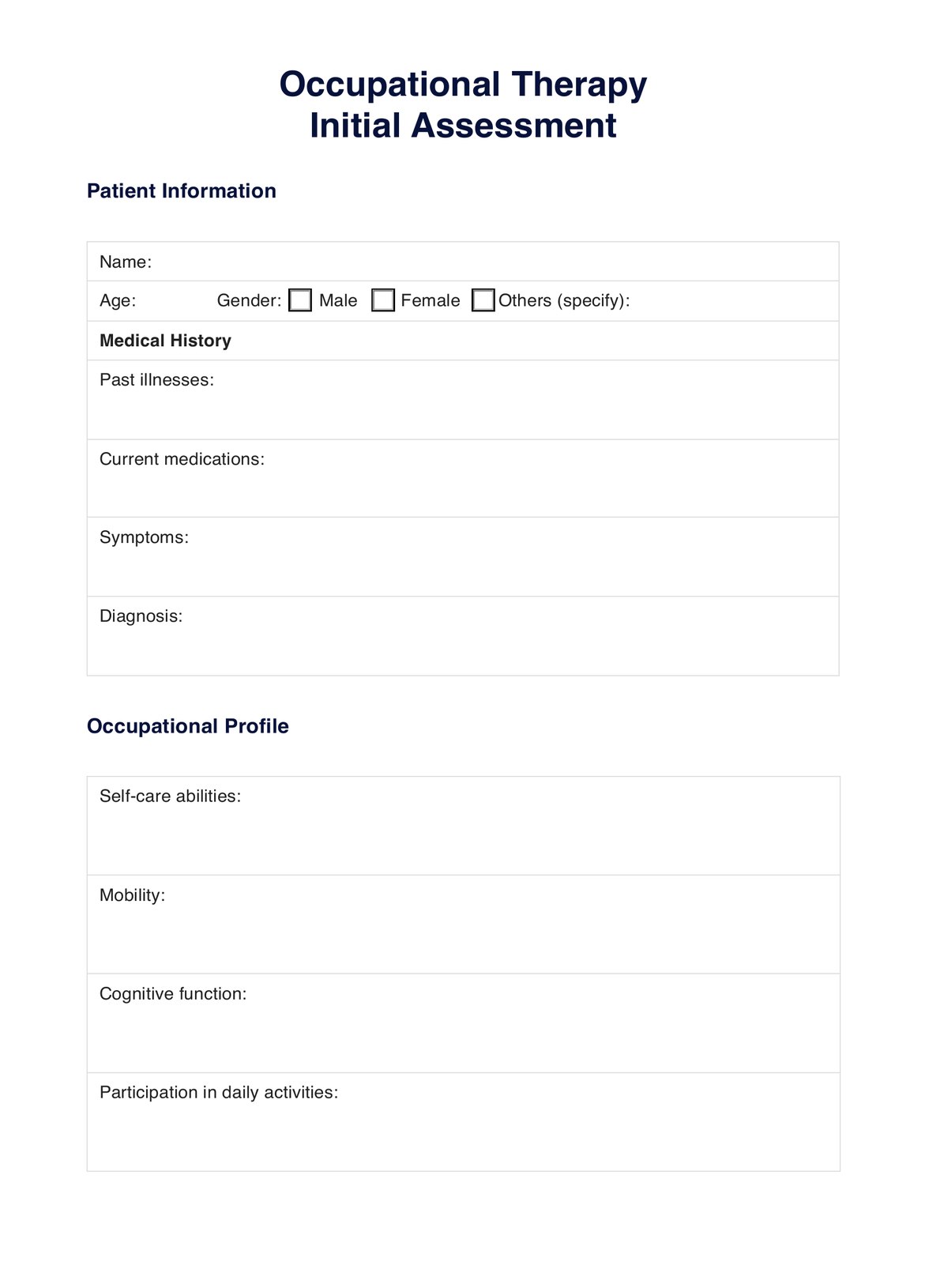 Optimize patient care with our Occupational Therapy Initial Assessment Template. Streamline assessments, set goals, and track progress efficiently!